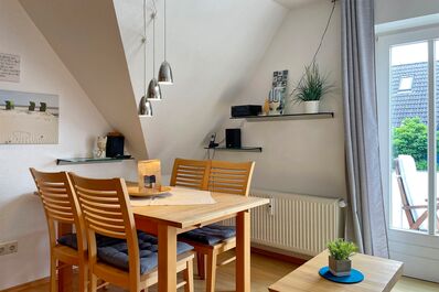 Die schöne Anlage Friesenperle in der Feldstraße 15 a und b besteht aus zwei Häusern mit jeweils 6 Wohneinheiten. Unsere hübsche ca. 45 m große Wohnung Friesenperle 5 befindet sich im ersten Obergeschoss des Hauses und erstreckt sich über zwei Etagen. Der offene Wohnraum mit einer gemütlichen Couch, WLAN, Stereoanlage sowie einer gemütlichen Essecke ist harmonisch aufeinander abgestimmt und lässt Sie die Urlaubstage genießen. Von hier aus gelangen Sie auf den Balkon, der in den Sommermonaten mit Gartenmöbeln bestückt ist. Die im Wohnzimmer integrierte Küchenecke mit Backofen, Mikrowelle, Wasserkocher und Kaffeemaschine ist gut ausgestattet, so dass es Freude macht, auch mal zu Hause zu Speisen. Weiterhin finden Sie im ersten Obergeschoss das Bad mit Dusche, welches hell gefliest und funktional ist. Ein Schlafraum, der ebenfalls mit einer Tür zum Balkon versehen ist, lädt zu herrlichen Nächten ein mit Doppelbett und Kleiderschrank. Eine Treppe führt Sie in das Dachgeschoss. Hier befindet sich im Galeriezimmer das Doppelbett und eine gemütliche Sitzgruppe mit Flachbild-TV, die sich hervorragend für Filmabenden oder für ein gemütliches Beisammensein anbietet, wenn man sie nicht gerade als Rückzugsmöglichkeit mit einem schönen Buch nutzen möchte. Auf dem Grundstück befindet sich eine kleine Grillecke, Abstellmöglichkeiten für Ihre Fahrräder, für jede Wohnung ein eigener Parkplatz sowie für unsere kleinen Gäste eine Doppelschaukel mit Kletterleiter um sich auszutoben. Im vorderen Gebäude steht allen Gästen zur gemeinschaftlichen Nutzung im Keller ein Waschraum mit Waschmaschine und Trockner ( jeweils gegen Gebühr), Wäscheständer und Bügelbrett mit Bügeleisen sowie eine Sauna (gegen Gebühr) mit Duschmöglichkeit und Ruheraum zur Verfügung. Durch die Lage in zweiter Reihe zur Straße ist die Anlage besonders bei befreundeten Familien, die gerne gemeinsam verreisen möchten beliebt, doch auch Pärchen verleben wunderbare Urlaubstage. Die zentrale Lage ermöglicht es in wenigen Minuten das Friesenmuseum, das Wellenbad Aqua Föhr und den Abenteuerspielplatz Löwenhöhle im nahe gelegenen Wald zu besuchen oder einen Spaziergang durch die hübschen Gassen der Wyker Innenstadt zu unternehmen, um die vielen freundlichen Cafés, Geschäfte und Restaurants kennenzulernen.