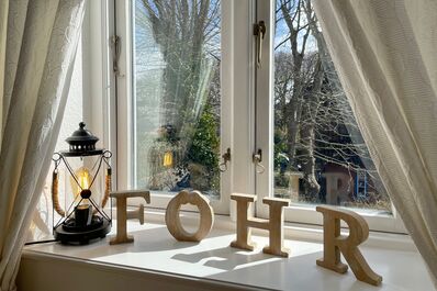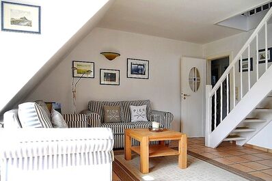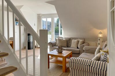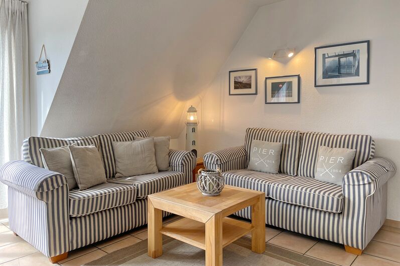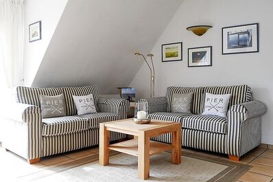 Unsere gemütliche Obergeschosswohnung Friesenperle 6 erstreckt sich über zwei Etagen und bietet 4 Gästen ausreichend Platz erholsame Urlaubstage zu verbringen. Das Bad ist mit Dusche mit flachem Einstieg und Handtuchheizkörper ist, verfügt über einen Doppelwaschtisch und ein Fenster. Der Schlafraum mit Doppelbett (160 x 200 cm) und Dachfenster mit Blick zu den Sternen lädt zum Träumen ein. Der Hauptwohnbereich mit integrierter Küche und Essplatz wirkt einladend und das Wohnzimmer mit zwei hübschen Sofagarnituren, WLAN, Flachbild-TV, DVD-Player, Haustelefon und Stereoanlage eignet sich hervorragend zum Entspannen. Von hier aus gelangen Sie auf den Südbalkon mit Gartenmöbeln (ca. April bis Oktober). Die Küchenzeile mit Ceranfeldherd und Backofen, Geschirrspüler, Kühlschrank mit Gefrierfach, Kaffeemaschine und einer zusätzlichen Senseo Maschine ist vollausgestattet. Im 2. Obergeschoss finden Sie einen weiteren offenen Schlafbereich vor mit zwei Einzelbetten (90 x 200 cm) und einem zweiten Fernseher. Ihr Hund ist hier ebenfalls herzlich Willkommen. Genießen Sie herrliche Urlaubstage in einer Wohnung, die keine Wünsche offen lässt.