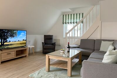 Das Haus am Stadtpark gelegen im Grünstreifen unweit des Stadtparkes mit seinen schönen Waldwegen und dem Abenteuerspielplatz Löwenhöhle ist eine gepflegte Anlage mit einem weitläufigen Grundstück. Hier befindet sich für alle Gäste der Anlage neben einem kleinen Spielplatz und einer Sitzecke auch die Möglichkeit gegen eine geringe Gebühr Waschmaschine und Trockner zu benutzen und die Fahrräder in dem Keller unterzustellen. Eine finnische Dampfsauna (gegen Gebühr) und ein kleiner Fitnessraum laden zum Verweilen ein. Viele Gäste genießen die ruhige Lage, wobei Sie einen Bäcker, einen Schlachter, den kleinen gut sortierten Einkaufsladen und natürlich den Strand und das Meer fußläufig erreichen können. Die Obergeschosswohnung im Haus am Stadtpark ist eine ideale Wohnung für Familien, welche sich über zwei Etagen erstreckt. Im 1. Obergeschoss befindet sich das moderne Badezimmer mit großzügiger Dusche, die beiden Schlafräume und der geräumige Wohnschlafraum mit integrierter Küche und Essplatz. Das Wohnzimmer verfügt über eine Sitzgarnitur (Schlafcouch 170 x 190 cm), einen elektrisch verstellbaren Relax Sessels , Smart-TV, WLAN und auf der anderen Seite des Raumes befindet sich die gut ausgestattete Küche mit einem Essplatz. Von hier aus gelangen Sie auf einen kleinen Balkon, der für 2 bis 3 Personen ausgerichtet ist. Ruhige Nächte verbringen Sie in den beiden Schlafzimmern. Das Elternschlafzimmer ist mit einem Doppelbett (180 x 200 cm) und einem Kleiderschrank ausgestattet, wobei das kleine Kinderzimmer ein Bett (90 x 200 cm) sowie eine Kommode vorweist.