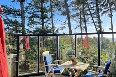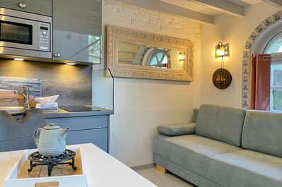 Die kompakte Pantryküche ist gut ausgestattet für Selbstversorger und bietet ein Kochfeld mit zwei Platten, eine Mikrowelle für schnelle Mahlzeiten, eine Filterkaffeemaschine für den perfekten Start in den Tag, sowie einen Wasserkocher, Toaster und Kühlschrank mit integriertem Gefrierfach. Das funktionale Badezimmer verfügt über eine ebenerdige Dusche und ein WC sowie ein kleines Kellerfenster, das für natürliche Belüftung sorgt. Genießen Sie die frische Meeresluft auf der höher gelegenen Dachterrasse, die Ihnen einen atemberaubenden Meer-und Panoramablick bietet. Hier finden Sie einen windgeschützten Bereich mit einer Sonnenliege zum Entspannen sowie Sitzgelegenheiten und einem Tisch für Mahlzeiten im Freien. Die "Kajüte" ist ideal für Alleinreisende: Erleben Sie einen unvergesslichen Urlaub in einer gemütlichen Atmosphäre mit Meerblick in unserer Kajüte!