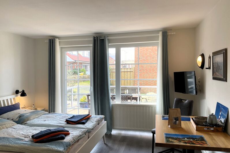Herzlich Willkommen auf Amrum und in unserer gemütlichen Ferienunterkunft Huus Waterkant 02. Diese liebevoll gestaltete Unterkunft bietet Ihnen genau den richtigen Rahmen für einen erholsamen und entspannten Urlaub. Im Mittelpunkt steht das einladende Wohn-/Schlafzimmer mit einem komfortablen Doppelbett für zwei Personen, das Ihnen erholsame Nächte garantiert. Ein geräumiger Schrank sorgt für ausreichend Stauraum, während die integrierte Küchenzeile kleine kulinarische Verwöhn-Momente ermöglicht. Der praktische Esstisch mit Stühlen lädt zum gemeinsamen Essen oder geselligen Spieleabenden ein.