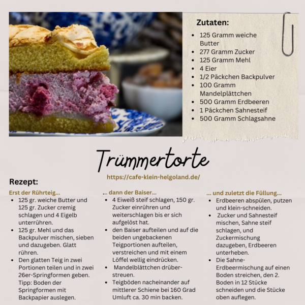 Ob du zur Trümmertorten-Fraktion gehörst oder ein begeisterter Friesentorten-Fan bist – beide Torten zaubern ein Stück Föhr direkt in dein Zuhause. Verwöhne dich und deine Liebsten doch einmal mit einer dieser originalen Föhrer Spezialitäten. Wir haben für dich zwei Inselrezepte gesucht & gefunden. Die Friesentorte haben wir gleich selbst gebacken nach einem Rezept der Familie und das Foto sowie das Rezept der Trümmertorte sind uns vom Café Klein Helgoland freundlicherweise zur Verfügung gestellt wurden. Viel Freude beim Nachbacken und Genießen!